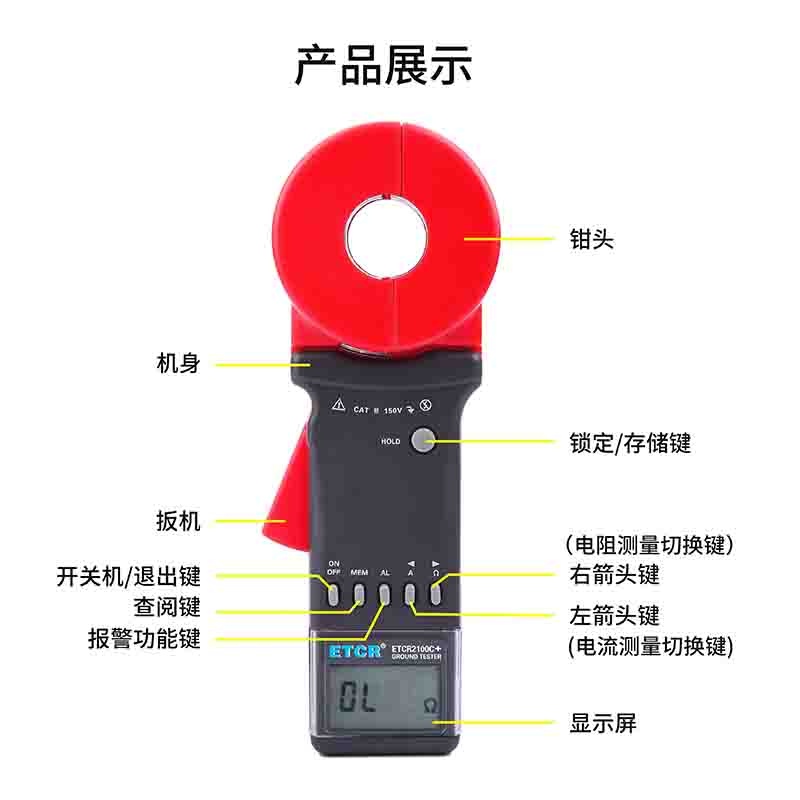 ETCR2100C+鉗形接地電阻儀又稱鉗形接地電阻表、接地電阻儀、回路電阻測試儀、單鉗接地電阻測試儀、環(huán)路電阻測試儀,用于接地電阻、回路電阻測量、接地電流測量、接地故障判斷。在測量有回路的接地系統(tǒng)時,不需斷開接地引下線,不需輔助接地極,安全快速、使用簡便。鉗形接地電阻儀廣泛應(yīng)用于電力、電信、氣象、油田、建筑及工業(yè)電氣設(shè)備等的接地電阻測量、回路電阻測量。
