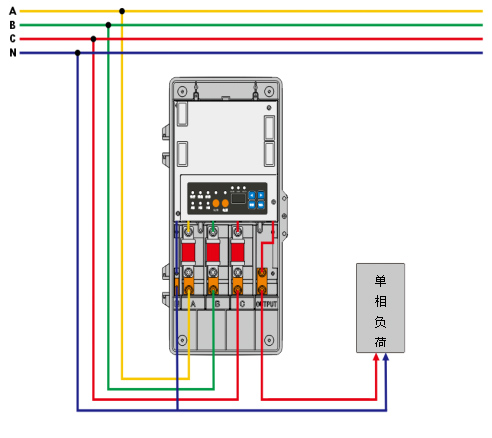 5、具有自動(dòng)旁路功能,當(dāng)輸入相的熔斷器熔斷,換相器將停止換相,并自動(dòng)將負(fù)載切換到有電相,保持用戶供電,更換熔斷器后,換相裝置即可恢復(fù)正常運(yùn)行。