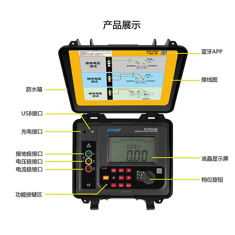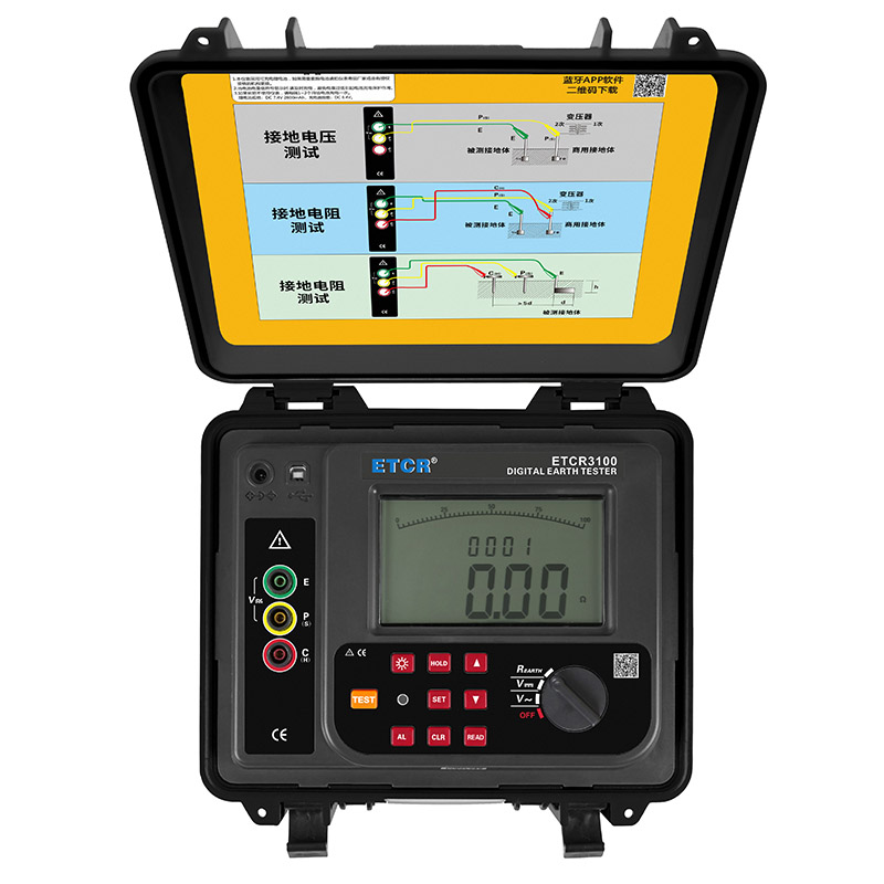 ETCR3000C數字式接地電阻測試儀又稱接地電阻表、數字接地電阻表、地樁式接地電阻儀、接地搖表,用于接地電阻測量、接地電壓測量,儀表采用數字及微處理技術,精密3線或簡易2線法測量接地電阻,其廣泛應用于電力、電信、氣象、建筑、防雷及工業(yè)電氣設備等行業(yè)。