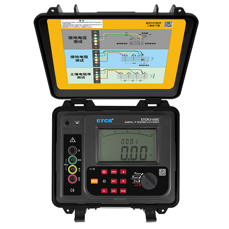 ETCR3100C接地電阻·土壤電阻率測試儀由主機、監(jiān)控軟件、測試線、輔助接地棒、通訊線等組成。主機超大LCD顯示,白屏背光,棒圖指示,一目了然。儀表具有報警功能,可設置報警閾值,具有數(shù)據(jù)存儲功能存儲400組數(shù)據(jù),藍牙通信功能,安裝APP可在移動終端查看測試數(shù)據(jù),USB通信功能,安裝上位機軟件后可將測試記錄下載電腦保存、分析、打印。