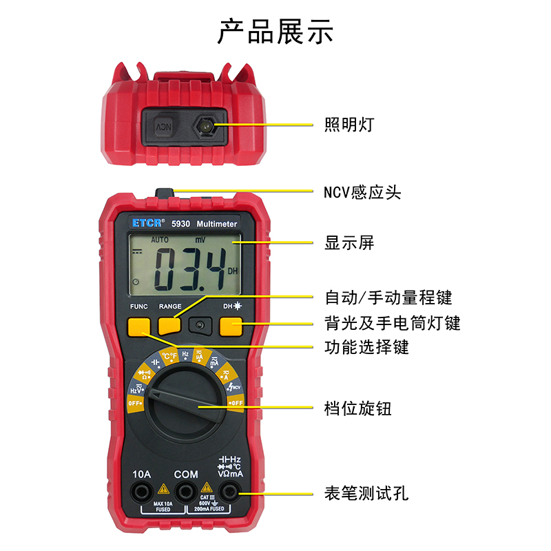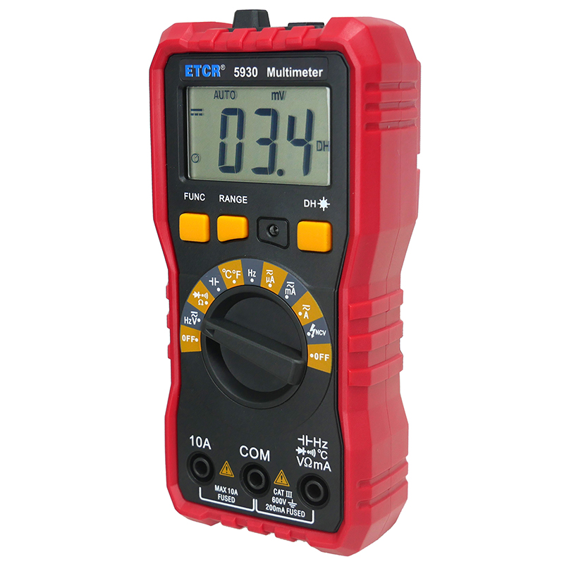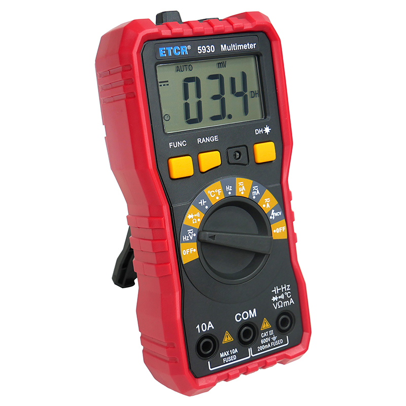 ETCR5930數(shù)字萬用表又稱數(shù)字萬能表、智能萬用表,是一款3 1/2位便攜式自動量程數(shù)字多用表,可測量交流電壓真有效值(TRMS)、直流電壓、交流電流真有效值(TRMS)、直流電流、電阻、頻率、電容、溫度、通斷測試、二極管正向壓降等。該儀表結(jié)構(gòu)精巧、操作容易、攜帶方便,是電工電子測量之理想工具。
