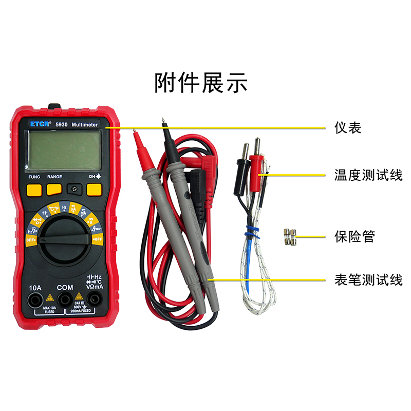 | ETCR5930數(shù)字萬用表 | DC 0.0mV~600V AC 0mV~600V | DC 0.0uA~10A AC 0.0uA~200mA | 0.0Ω~20MΩ | 0.0nF~2mF | 0.0Hz~20MHz | 0℃~1000℃ |
