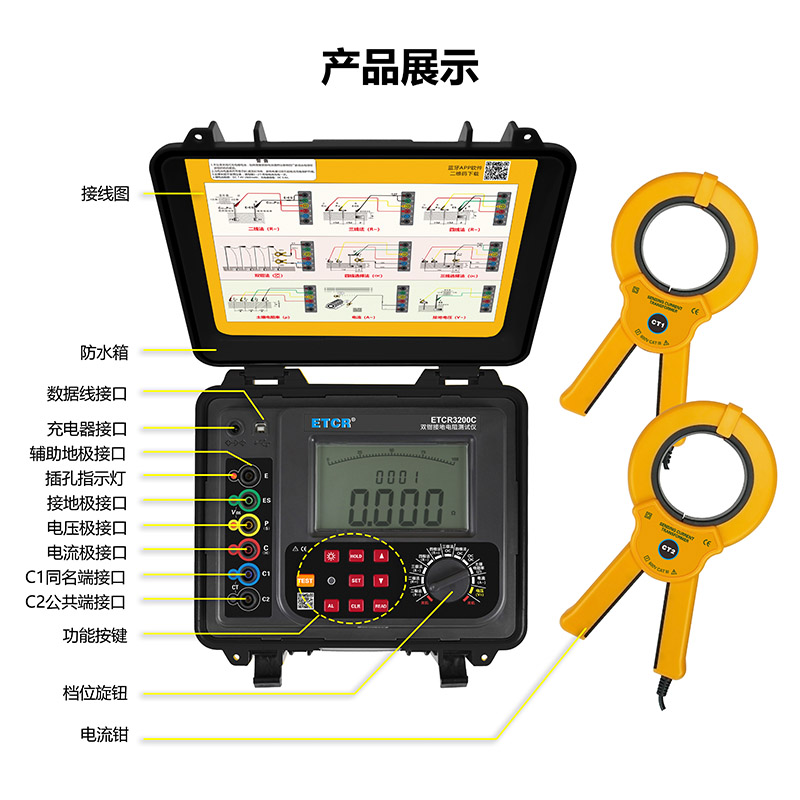 ETCR3200C雙鉗多功能接地電阻測試儀由主機(jī)、電流鉗(雙鉗)、測試線、輔助接地棒、通訊軟件、通訊線等組成。主機(jī)超大LCD顯示,具有背光、棒圖指示,一目了然。儀表具有存儲功能,時鐘功能,自動存儲含有時間的測試結(jié)果2000組。儀表具有支持安卓系統(tǒng)的藍(lán)牙通信功能,安裝APP后可在移動終端進(jìn)行測試或讀取測試記錄,給你帶來全新體驗。儀表具有USB通信,存儲數(shù)據(jù)通過USB接口上傳PC機(jī),通訊軟件可以實現(xiàn)歷史記錄數(shù)據(jù)讀取、查閱、保存、報表、打印等功能。儀表廣泛應(yīng)用于電力、電信、氣象、油田、建筑、防雷及工業(yè)電氣設(shè)備等行業(yè)。