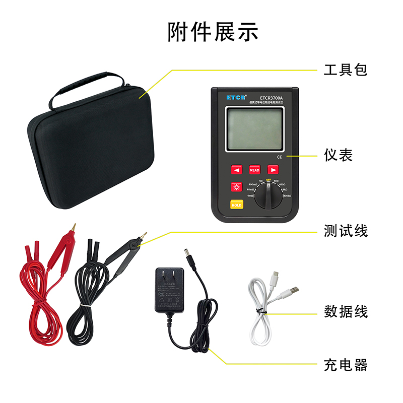 測試儀:1件;測試線:4條;USB通訊線:1條;專用充電器:1件;工具包:1件;表筆:2支