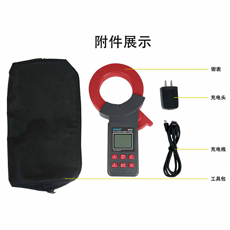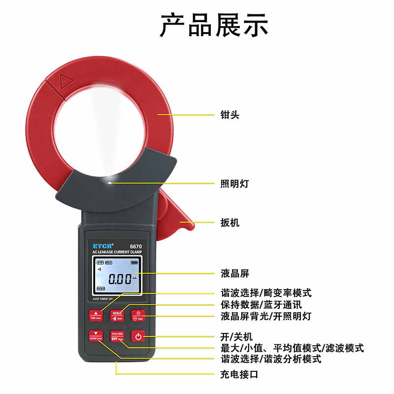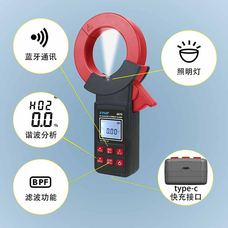 ETCR6670鉗形漏電流表可測試40Hz~1kHz頻率范圍的電流。鉗表還具有背光、手電筒、數(shù)據(jù)存儲、藍牙通訊等功能。鉗表使用大容量鋰電池type-c充電口,是一款新型的電工安全檢測必備工具。