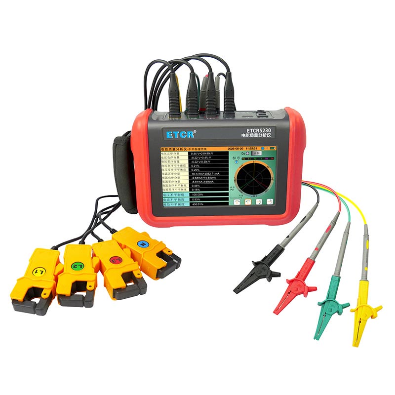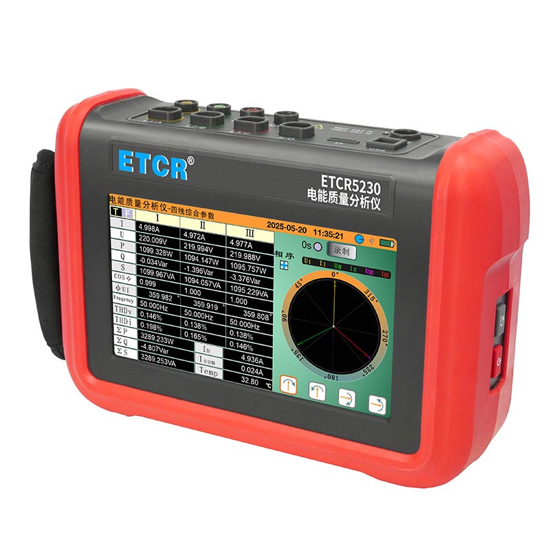 ETCR5230電能質量分析儀是我公司精心研制的一款專為現(xiàn)場測試三相電能質量的高精度綜合型測試儀器。儀表具有智能化、功能完善、人機操作簡潔、中英文雙語操作界面等特點。儀表采用7寸觸摸彩屏、體積小重量輕、攜帶方便,可選配多款電流鉗。儀表可同時測量4路電流(ABC三相及中性線電流),3路電壓、三相不平衡度、有功功率、無功功率、視在功率、諧波比、總諧波失真度等;顯示電流電壓的實時波形、相量圖;動態(tài)捕捉電壓電流瞬時變化,監(jiān)測啟動電流,監(jiān)測各電力參數(shù)并生成告警列表,長時間記錄測試數(shù)據(jù)并生成趨勢曲線圖等功能。