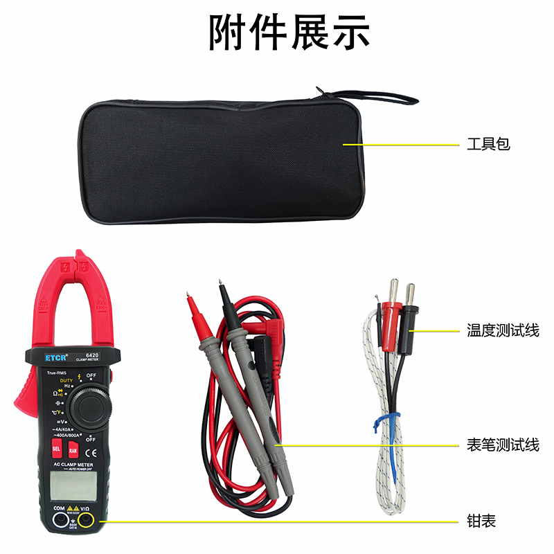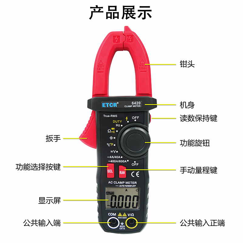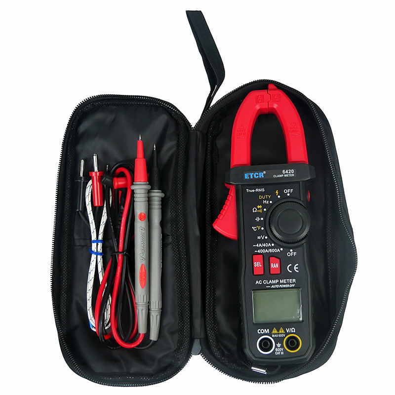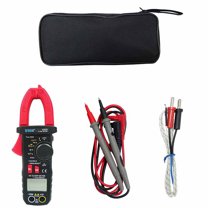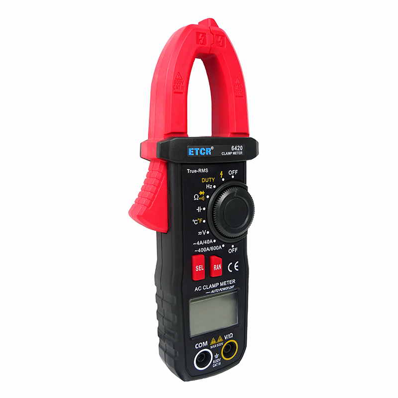 ETCR6420鉗形萬用表又稱多功能鉗形電流表,是一種便攜式鉗形數(shù)字多用表,可測量直流電壓、交流電壓電流真有效值、電阻、頻率、通斷測試、溫度、二極管正向壓降等參數(shù),電容測量量程擴(kuò)大到10mF且測量大電容速度快。該儀表結(jié)構(gòu)小巧、操作容易、攜帶方便,是電氣測量之理想工具。為用電檢查人員提供一種安全、準(zhǔn)確、便捷的新型電力儀表,是電工安全檢測的必備工具。
