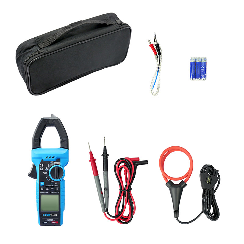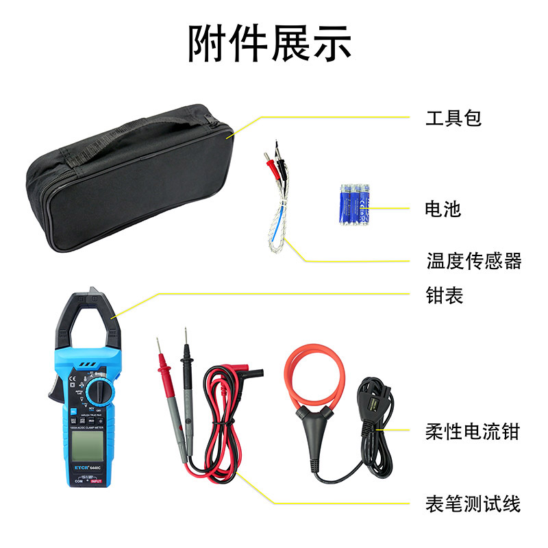 鉗表:1件;表筆:1套;溫度傳感器:1件;1.5V電池:3節(jié);工具包:1件