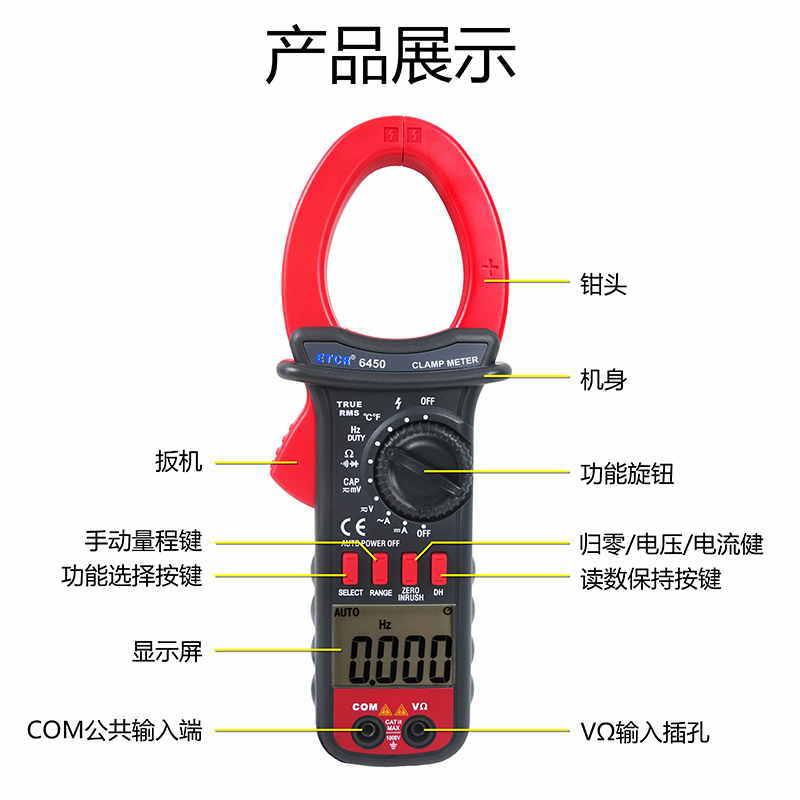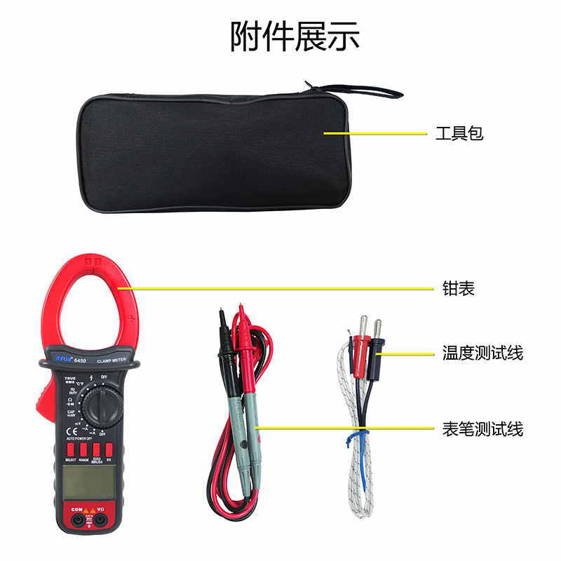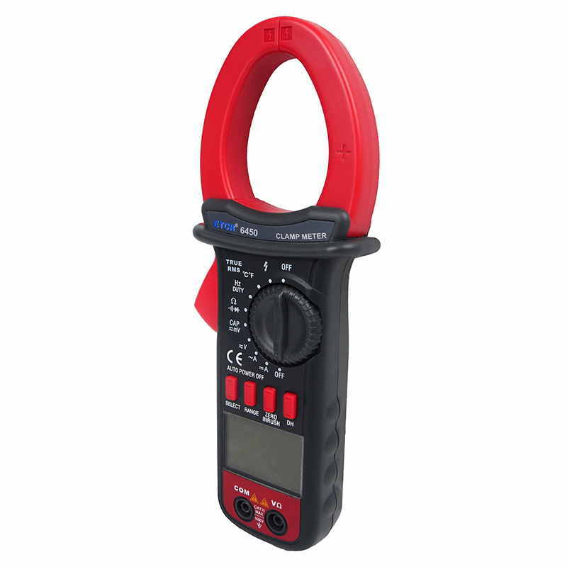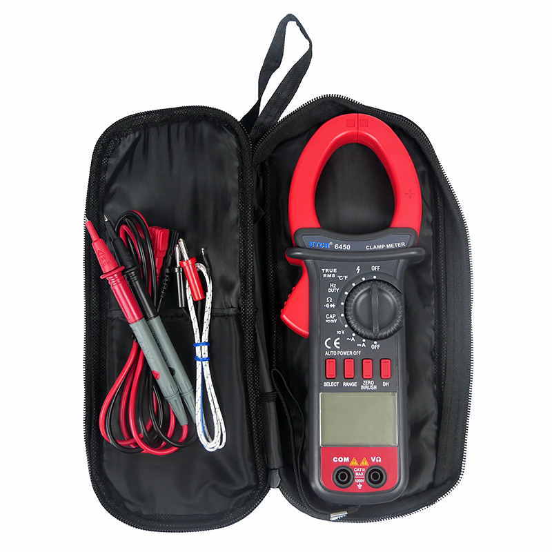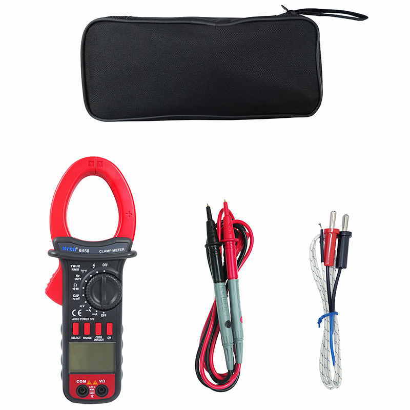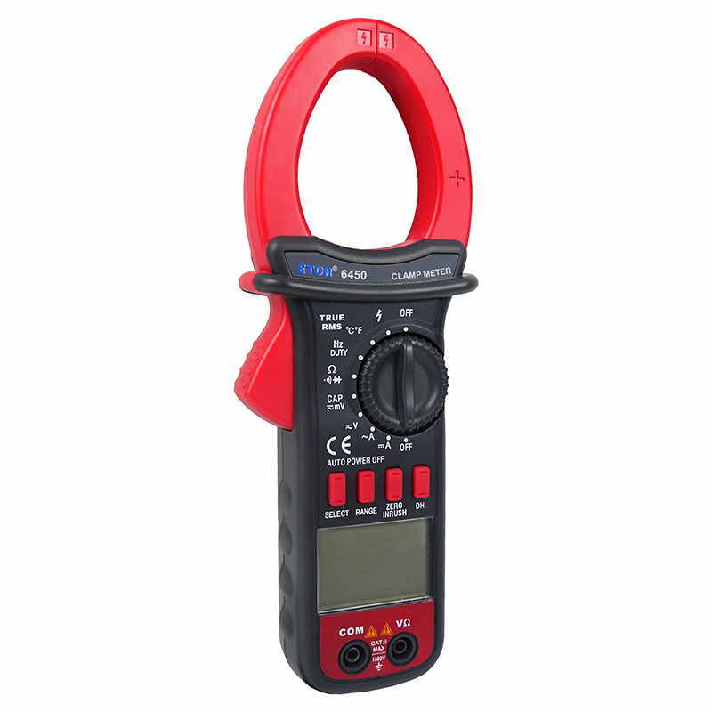 ETCR6450鉗形萬用表又稱多功能鉗形電流表,儀表采用高性能的新型MCU處理器,儀表具有極高的性價(jià)比,它具備高可靠性、高安全性、自動(dòng)量程、手持式鉗形表等特點(diǎn)。具有超大屏幕數(shù)字,全量程過載保護(hù),數(shù)據(jù)保持、欠壓提示、自動(dòng)關(guān)機(jī)功能,真有效值測(cè)量能準(zhǔn)確測(cè)量變頻電壓,非正弦波電壓,浪涌電流能測(cè)量周期為80mS的浪涌電流有效值,再配有能準(zhǔn)確測(cè)量-50~1000℃的溫度測(cè)量功能,使本儀表非常適合變頻電源、空調(diào),冰箱等制冷設(shè)備,電機(jī)性能檢測(cè)等, DC40A、400A、1000A量程的直流電流功能廣泛適用于電鍍,直流焊機(jī)、汽車檢測(cè)及各種直流500mA以上電流測(cè)量場(chǎng)合。