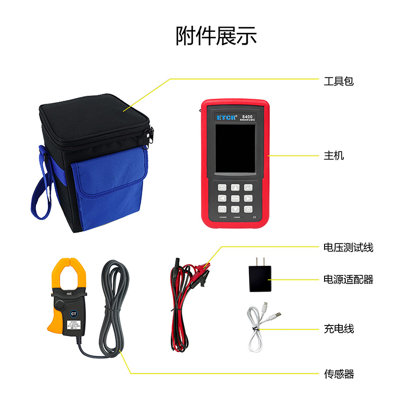 隨機(jī)附件 | 主機(jī)1件;互感器1個(gè)(ETCR8400)/3個(gè)(ETCR8430);電壓輸入線2條(ETCR8400)/4條(ETCR8430);數(shù)據(jù)線1個(gè);電源適配器1個(gè);工具包1件 |