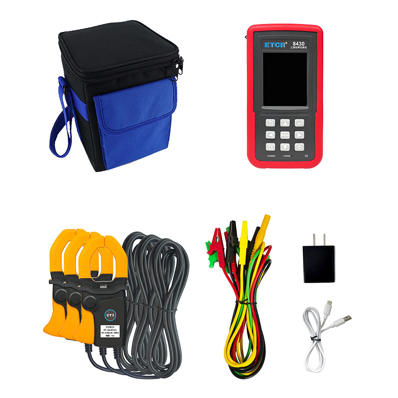 主機(jī)1件;互感器1個(ETCR8400)/3個(ETCR8430);電壓輸入線2條(ETCR8400)/4條(ETCR8430);數(shù)據(jù)線1個;電源適配器1個;工具包1件