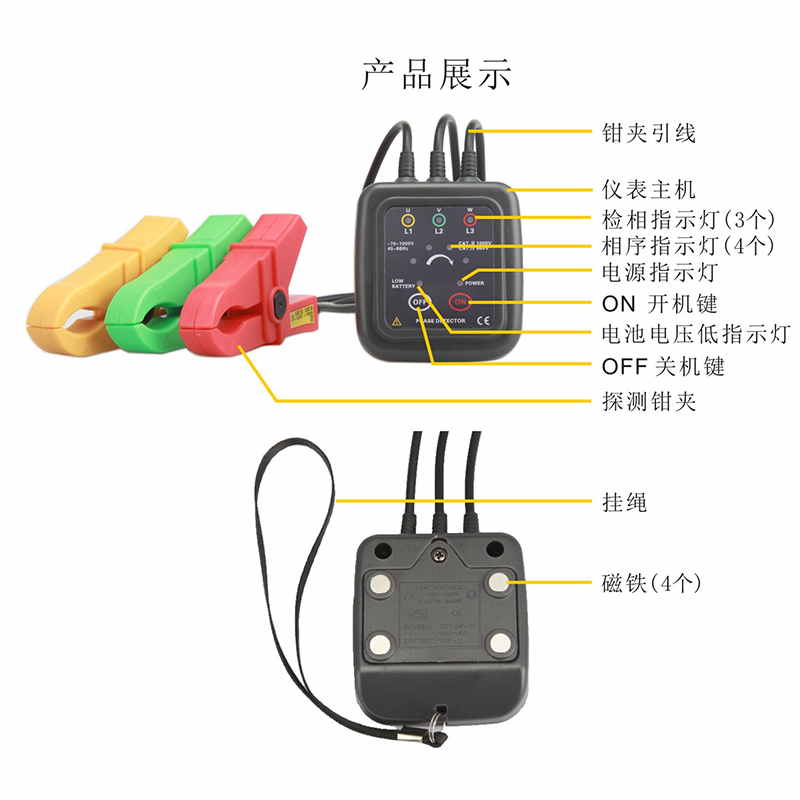 用于相序檢測(cè)(正相、逆相、缺相)、活線檢查、簡(jiǎn)易檢電、火線識(shí)別、缺相判斷、斷線位置查找、線路檢修
