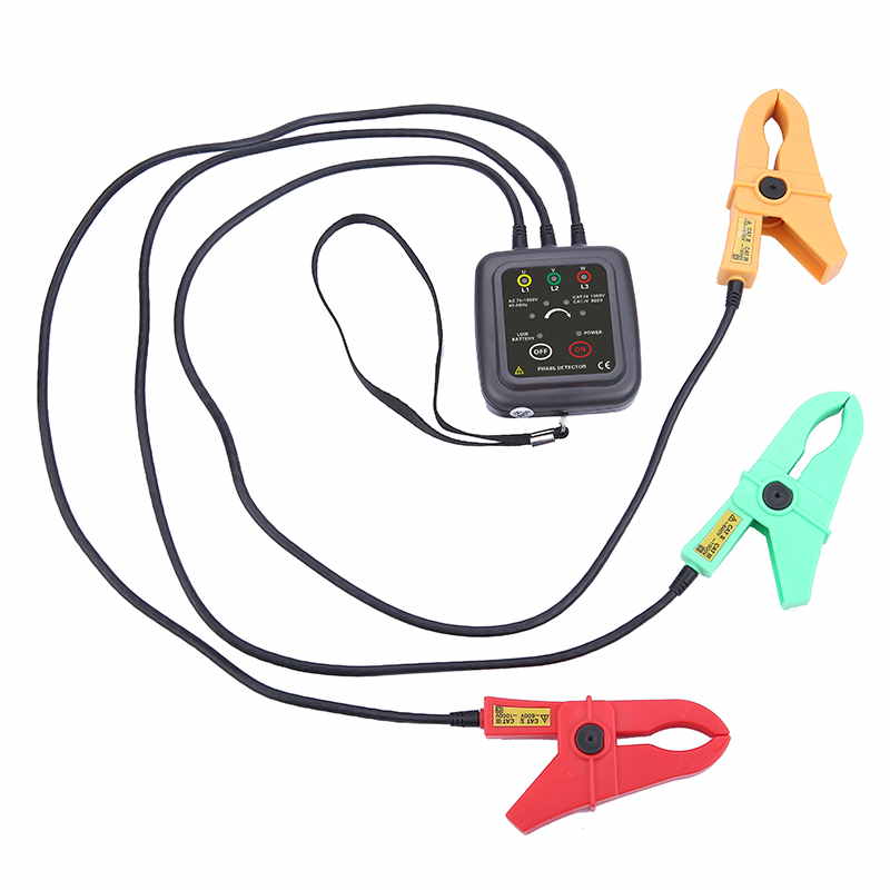 1、采用鉗形非接觸感應(yīng)式測(cè)量,不用剝開(kāi)電纜線外皮,無(wú)需接觸高壓裸露火線,直接將三個(gè)超感應(yīng)高絕緣鉗夾分別夾住三相火線的絕緣外皮即可檢測(cè)相序。