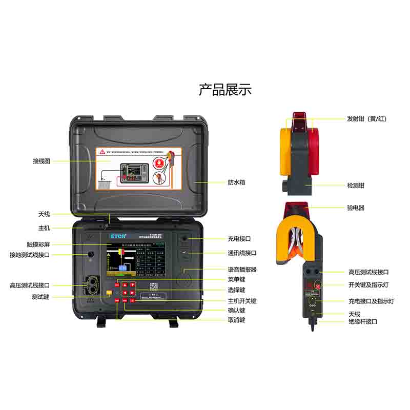 ETCR1400架空線路接地故障巡查儀又稱二分法架空線路接地故障查找儀、 架空線路單相接地故障定位儀、小電流接地故障定位儀、配網(wǎng)專用架空線路故障定位儀,儀器由主機(jī)、檢測(cè)鉗、測(cè)試線、接地針、絕緣桿及附件組成,主機(jī)與檢測(cè)鉗間采用無(wú)線通訊。主機(jī)采用7寸彩屏,故障指向清晰明了,測(cè)試結(jié)果一目了然,主機(jī)具有語(yǔ)音播報(bào)功能,語(yǔ)音提示線路故障方向,使得現(xiàn)場(chǎng)操作更加輕松。創(chuàng)新的檢測(cè)鉗集信號(hào)發(fā)射、采集于一體,鉗形結(jié)構(gòu),體積小,重量輕,掛裝方便,一次掛裝即可完成線路故障查找,操作簡(jiǎn)易快速,極大減輕了測(cè)試的工作強(qiáng)度,提高工作效率。檢測(cè)鉗自帶非接觸驗(yàn)電器,能檢驗(yàn)電纜線是否帶電,并發(fā)出聲光報(bào)警,確保操作人員和設(shè)備的安全。儀器還具有藍(lán)牙通訊功能,USB通訊接口。