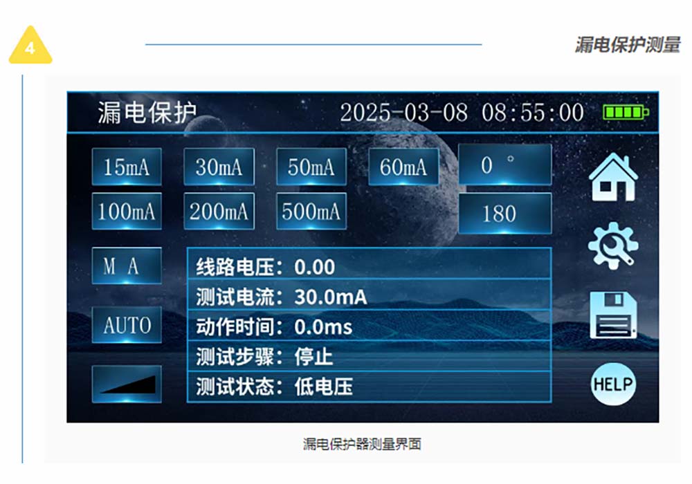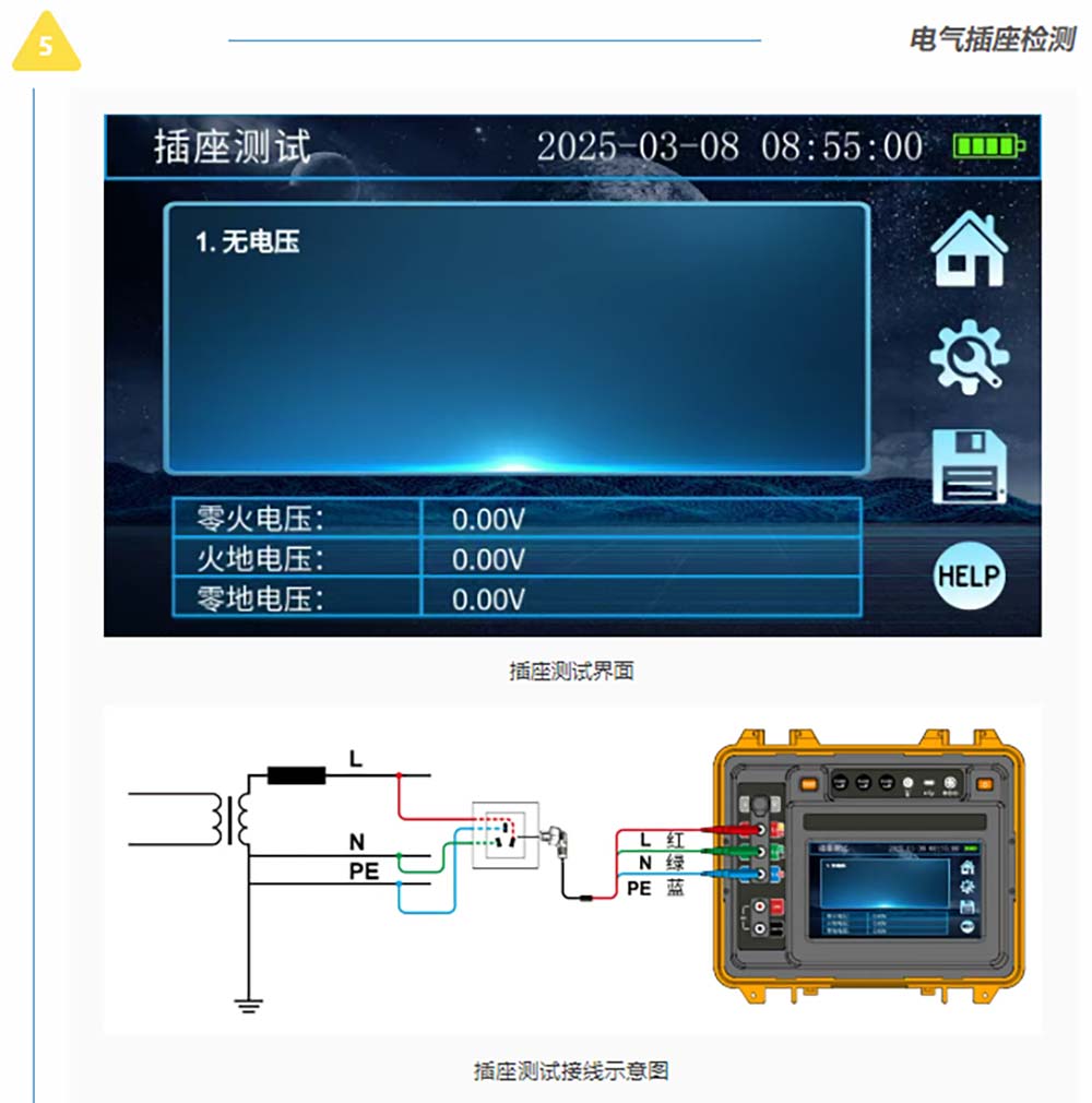 接地/絕緣/直流電阻測試、RCD漏電保護檢測、電氣插座檢測、電流有效值測試、交流電壓測試、相序測試等電力參數(shù)測試。